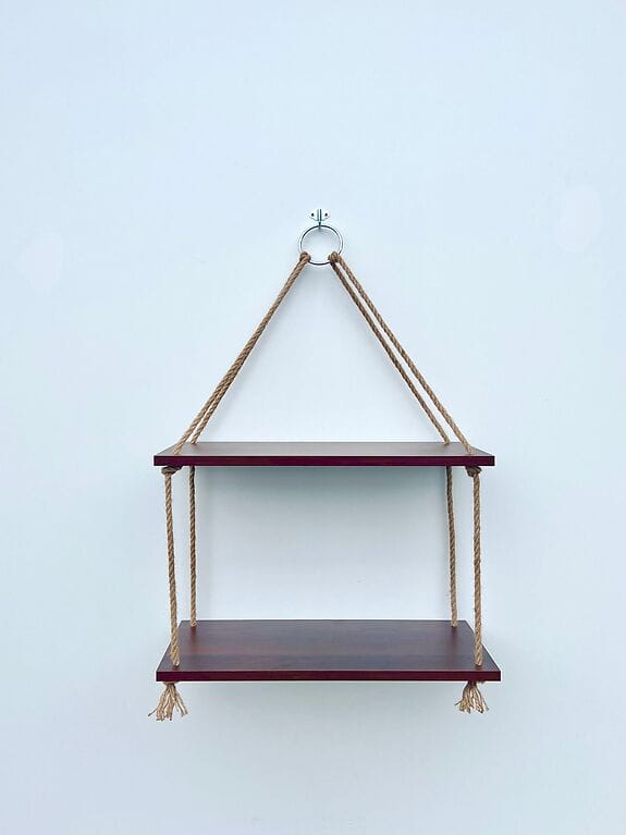Każda półka powstaje z dbałością o najmniejszy szczegół – z grubej płyty laminowanej 18mm, pokrytej wytrzymałą okleiną. Sznurki z naturalnej liny jutowej