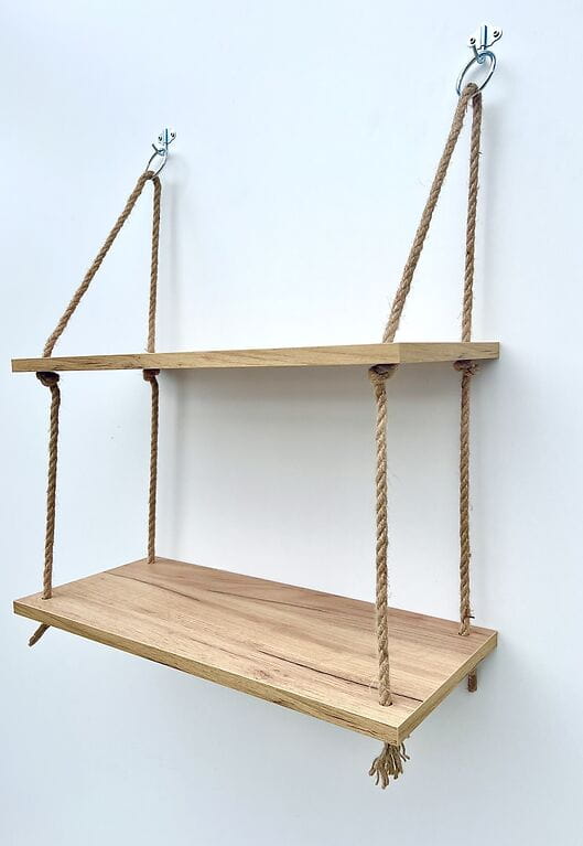 Każda półka powstaje z dbałością o najmniejszy szczegół – z grubej płyty laminowanej 18mm, pokrytej wytrzymałą okleiną. Sznurki z naturalnej liny jutowej