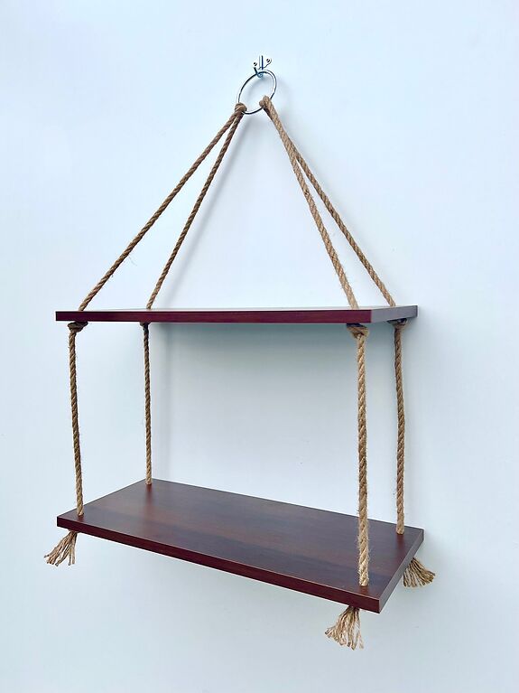 Designerska półka wisząca na linach jutowych o pojedynczym mocowaniu. Ręcznie wykonana w stylu Boho. Półka jest funkcjonalna, a równocześnie niezwykle dekoracyjna. Idealnie sprawdzi się do każdego wnętrza ozdabiając je swoim ciekawym wyglądem. Każda półka powstaje z dbałością o najmniejszy szczegół – z grubej płyty laminowanej 18mm, pokrytej wytrzymałą okleiną.