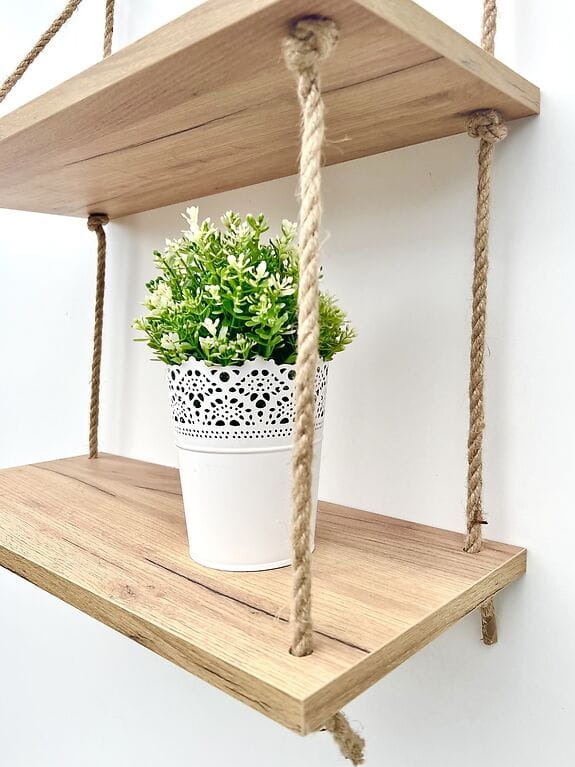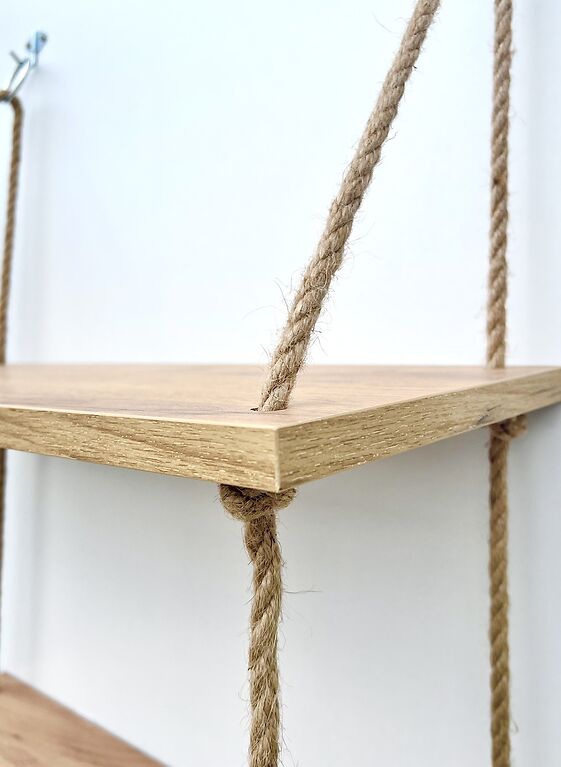 Każda półka powstaje z dbałością o najmniejszy szczegół – z grubej płyty laminowanej 18mm, pokrytej wytrzymałą okleiną. Sznurki z naturalnej liny jutowej