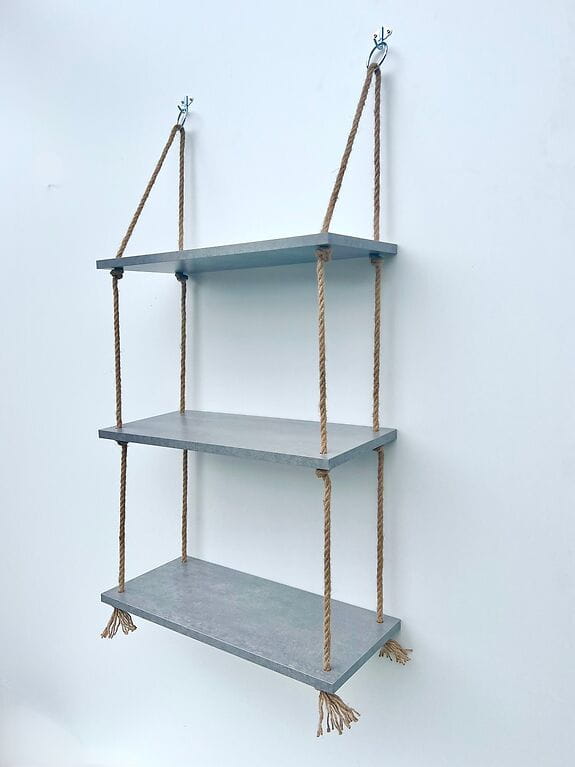 Każda półka powstaje z dbałością o najmniejszy szczegół – z grubej płyty laminowanej 18mm, pokrytej wytrzymałą okleiną. Sznurki z naturalnej liny jutowej