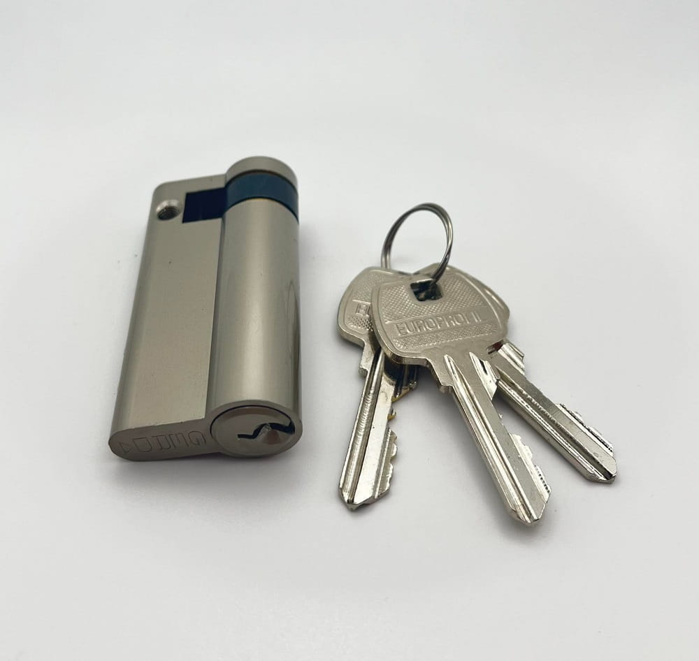 Wkładka bębenkowa Gerda 55/10, jednostronna, 3 klucze, nikiel. Stosuje się ją w zamkach wpuszczanych, gdzie wymagane jest zamykanie drzwi tylko z jednej strony, np. w drzwiach garażowych, piwnicach, bramach itp.