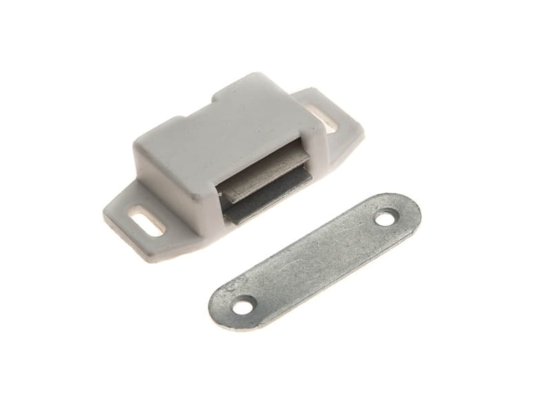 Zatrzask meblowy magnetyczny, biały. Wykorzystywany może być do wszystkich rodzajów drzwiczek w meblach kuchennych, pokojowych, łazienkowych i innych. Wykonany jest z metalu oraz tworzywa sztucznego.