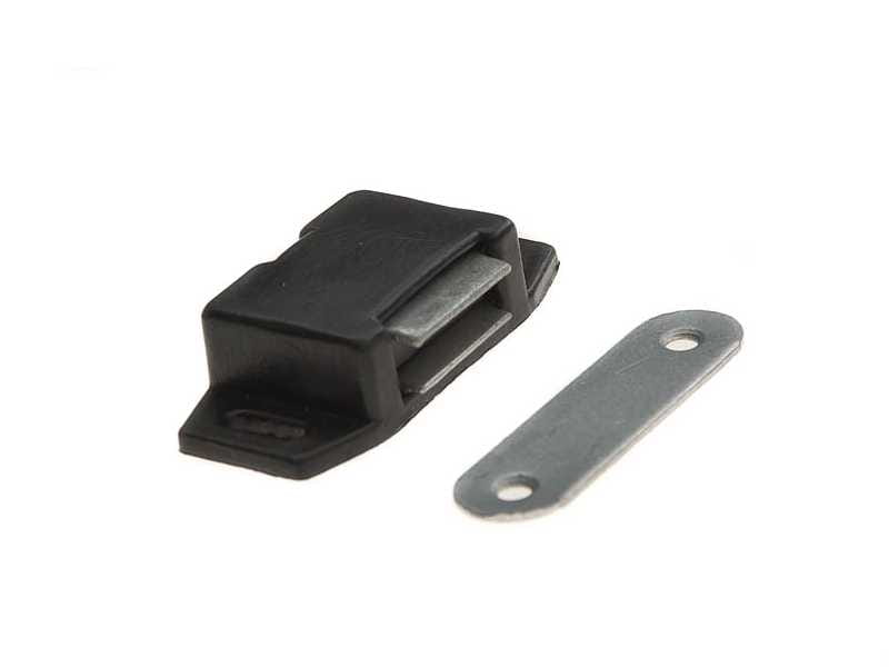 Zatrzask meblowy magnetyczny, czarny. Wykorzystywany może być do wszystkich rodzajów drzwiczek w meblach kuchennych, pokojowych, łazienkowych i innych. Wykonany jest z metalu oraz tworzywa sztucznego.